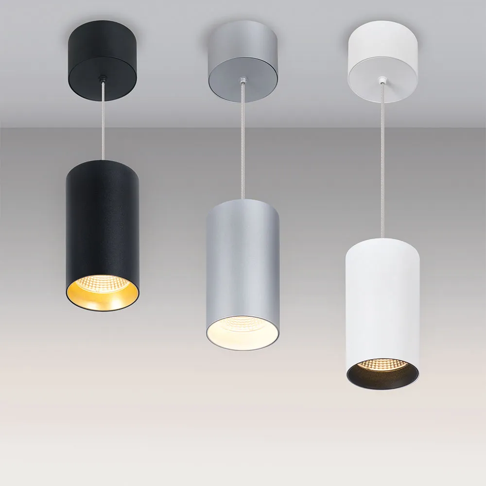 Подвесной светильник 15Вт, белый круглый корпус, черная вставка, металл. Цвет ТЕПЛЫЙ БЕЛЫЙ 3000K, св.поток 1100лм, CRI(Ra)>80, угол 40°. Размер Ø85x155мм. Встроенный драйвер PRI:220-240VAC, SEC:DC 350mA 23-36V 15Вт.