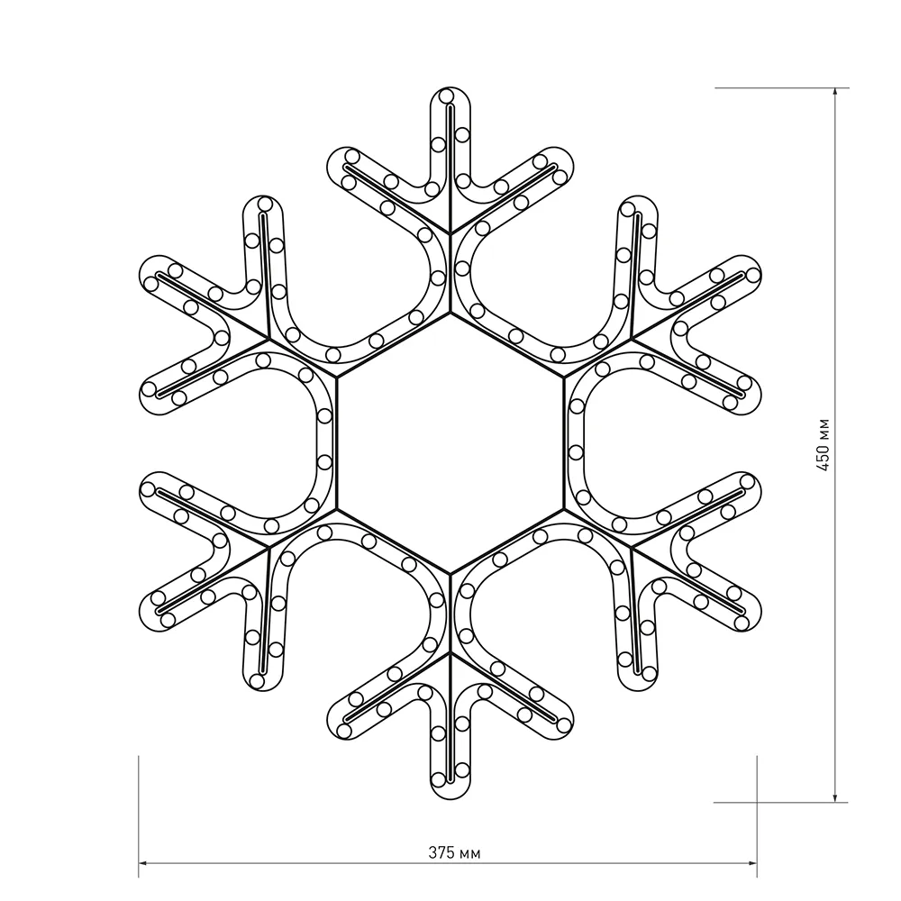 Светодиодная фигура СНЕЖИНКА. Размер 450x375 мм. Цвет светодиодов ТЕПЛЫЙ БЕЛЫЙ (3000 К), постоянное свечение. 108 светодиодов. Напряжение питания 230 В, потребляемая мощность 6.5 Вт, степень пылевлагозащиты IP65. Фигура укомплектована проводом питания для подключения к сети 230 В (без вилки питания).