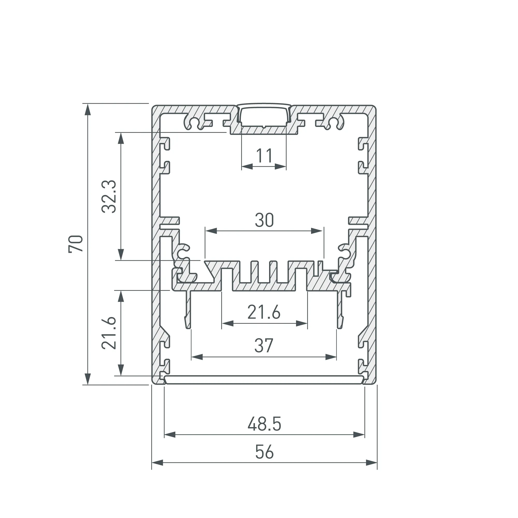 Под заказ от 20 м. Алюминиевый анодированный профиль для светодиодных лент и линеек. С отсеком для блока питания (размер отсека 32х37 мм). Съемная площадка для ленты позволяет легко проводить монтаж/демонтаж. Свечение в две стороны: основное (вниз) и дополнительное (вверх). Габаритные размеры (L×W×H): 2000x56x70 мм. Ширина площадки для ленты 37 мм., при использовании рефлекторов арт. 030319 ширина площадки 21 мм. Экраны, заглушки и другие аксессуары приобретаются отдельно. Цена за 1 метр. Сроки и цену уточняйте у менеджера.