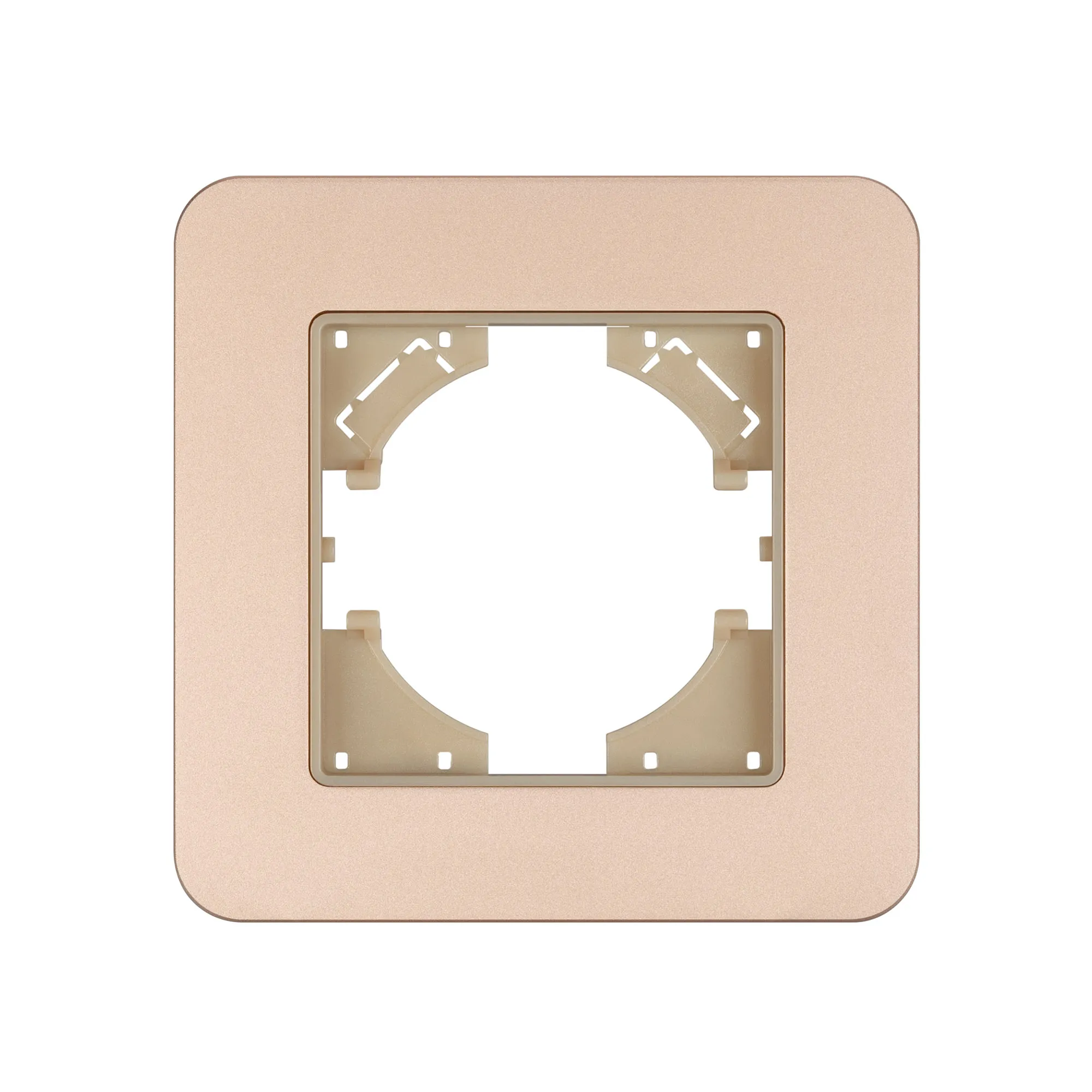 Рамка алюминиевая на 1 пост, под встраиваемый механизм. Цвет - золотой с Soft-Touch покрытием. Уровень герметичности IP20. Ориентация монтажа - горизонтальная (основным ориентиром служат посадочные выступы для накладки механизма).